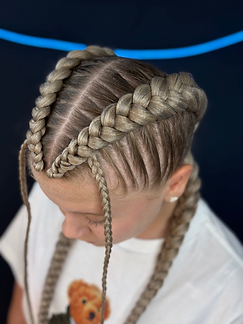 Two voluminous Dutch braids with added synthetic hair for extra length and fullness. You can choose any color – natural shades, ombré, or bright accents. Suitable for daily wear, sports and travel. Safe for natural hair. Wearing Time: 3-7 days. If micro braids or additional braids are added - can last longer. Cost: From $100 Includes synthetic hair. Accessories, micro braids and extra braids are paid separately. Price may increase depending on natural hair length and thickness.